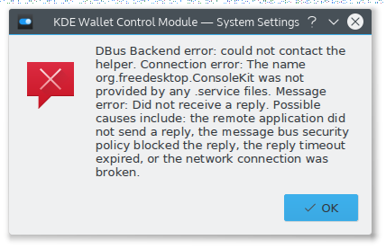 Because polkit-qt-1 still use ConsoleKit, so KAuth might failed to work owing to without ConsoleKit dbus service in new Linux distribution using systemd-logind https://pbs.twimg.com/media/CWu7z1yU4AAJ70q.png so it need to migrate polkit-qt-1 to systemd-logind, and here is the patch https://git.reviewboard.kde.org/r/125856/ Reproducible: Always