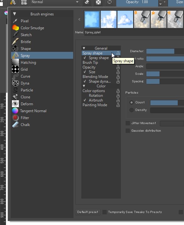 Spray brush engine has two "spray shape" parameters. https://pbs.twimg.com/media/CqLxAaUUkAAUJM4.jpg That's wierd and confusing In fact "spray shape" parameter which doesn't has checkbox is probably "spray area" parameters. https://docs.krita.org/Spray#Spray_Area Reproducible: Always