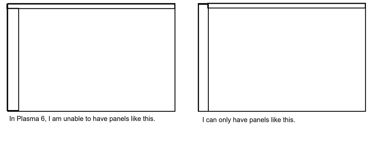 Created attachment 168959 [details] description of bug *** If you're not sure this is actually a bug, instead post about it at https://discuss.kde.org If you're reporting a crash, attach a backtrace with debug symbols; see https://community.kde.org/Guidelines_and_HOWTOs/Debugging/How_to_create_useful_crash_reports *** SUMMARY In KDE Plasma 6, I am unable to have a maximized panel on the top, alongside a panel on the left. I can only have a maximized panel on the left, alongside a panel on the top. Is there any reason for this, or is this a bug? STEPS TO REPRODUCE 1. Add a panel on the left side of the screen and on the top of the screen 2. Try to make the top panel full width, with the left panel underneath the top panel 3. Notice you can't do that. With a panel on the left, it won't let me resize the top panel to be full width. OBSERVED RESULT See image for details. https://i.postimg.cc/PJMDT4Gc/plasma-6-panel-bug.png EXPECTED RESULT For it to work like in Plasma 5. SOFTWARE/OS VERSIONS Operating System: Fedora Linux 40 KDE Plasma Version: 6.0.4 KDE Frameworks Version: 6.1.0 Qt Version: 6.7.0 Graphics Platform: Wayland ADDITIONAL INFORMATION