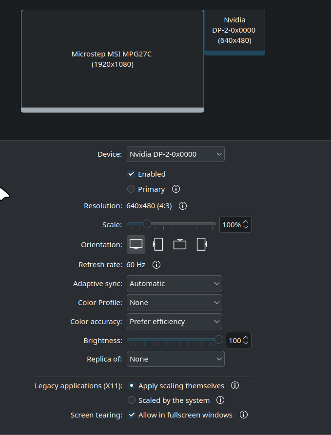 SUMMARY First time that it has happened. Desktop when to lock screen, the main monitor went to blackscreen and a bit after without me doing anything came back as big font while locked, only the main monitor. I then unlocked and it stayed as it showed. Working, out of monitor order, but changed. I then checked the display configuration, and it was because the monitor went back to 640x480 with a different name. And with no other resolution available, nor the higher refresh rate or HDR. STEPS TO REPRODUCE 1. Not sure OBSERVED RESULT I described in the summary. EXPECTED RESULT To continue working normally. SOFTWARE/OS VERSIONS Linux/KDE Plasma: Arch Linux based distro, all updated (wayland) KDE Plasma Version: 6.3.5 KDE Frameworks Version: 6.14.0 Qt Version: 6.9.0 ADDITIONAL INFORMATION ``` Output: 2 DP-2 enabled connected priority 2 DisplayPort Modes: 31:640x480@60*! Geometry: 1920,0 640x480 Scale: 1 Rotation: 1 Overscan: 0 Vrr: Automatic RgbRange: unknown HDR: incapable Wide Color Gamut: incapable ICC profile: none Color profile source: sRGB Color power preference: prefer efficiency and performance Brightness control: supported, set to 100% and dimming to 100% ``` This is the correct output from the same monitor. ``` Output: 1 DP-2 enabled connected priority 1 DisplayPort Modes: 1:2560x1440@60! 2:2560x1440@360* 3:2560x1440@240 4:2560x1440@144 5:2560x1440@120 6:2560x1440@100 7:2368x1332@360 8:2368x1332@240 9:1920x1080@360 10:1920x1080@240 11:1920x1080@120 12:1024x768@60 13:800x600@60 14:640x480@60 Geometry: 0,0 2560x1440 Scale: 1 Rotation: 1 Overscan: 0 Vrr: Never RgbRange: unknown HDR: enabled SDR brightness: 650 nits SDR gamut wideness: 20% Peak brightness: 673 nits Max average brightness: 400 nits Min brightness: 0.0994 nits Wide Color Gamut: enabled ICC profile: /home/user/.dotfiles/configs/pg27aqn_color_profile.icm Color profile source: ICC Color power preference: prefer efficiency and performance Brightness control: supported, set to 50% and dimming to 100% ``` Last logs in time range of when it happened was. ``` mai 26 16:10:06 desktop-pc kernel: kauditd_printk_skb: 4781 callbacks suppressed mai 26 16:14:28 desktop-pc kernel: kauditd_printk_skb: 183 callbacks suppressed mai 26 16:14:28 desktop-pc plasmashell[3411]: kf.plasma.quick: Exposed with no visual parent. Window positioning broken. mai 26 16:14:28 desktop-pc plasmashell[3411]: kf.plasma.quick: Exposed with no visual parent. Window positioning broken. mai 26 16:14:28 desktop-pc plasmashell[3411]: error creating screencast "Could not find window id {54f517f4-eab3-4415-8fef-e5f6ac2eeea9}" mai 26 16:14:29 desktop-pc kwin_wayland[3290]: kwin_core: KWin::LayerShellV1Window doesn't support setting maximized state mai 26 16:14:29 desktop-pc kwin_wayland[3290]: kwin_core: KWin::LayerShellV1Window doesn't support setting fullscreen state mai 26 16:14:30 desktop-pc plasmashell[3411]: error creating screencast "Could not find window id {54f517f4-eab3-4415-8fef-e5f6ac2eeea9}" mai 26 16:14:30 desktop-pc org_kde_powerdevil[3458]: No traced function stack for current thread mai 26 16:14:31 desktop-pc org_kde_powerdevil[3458]: No traced function stack for current thread mai 26 16:14:31 desktop-pc kwin_wayland[3290]: kwin_core: KWin::LayerShellV1Window doesn't support setting maximized state mai 26 16:14:31 desktop-pc kwin_wayland[3290]: kwin_core: KWin::LayerShellV1Window doesn't support setting fullscreen state mai 26 16:14:31 desktop-pc plasmashell[3411]: error creating screencast "Could not find window id {54f517f4-eab3-4415-8fef-e5f6ac2eeea9}" mai 26 16:14:32 desktop-pc org_kde_powerdevil[3458]: [ 3581] (i2c_check_open_bus_alive) Retrying i2c_check_edid_exists_by_dh() (c): Slept for 1000 millisec mai 26 16:14:32 desktop-pc kwin_wayland[3290]: kwin_core: EDID colorimetry xy(0.330078, 0.297852) xy(0.597656, 0.149414) xy(0.0605469, 0.314453) xy(0.328125, 0.00292969) is is invalid mai 26 16:14:32 desktop-pc kwin_wayland[3290]: kwin_core: EDID colorimetry xy(0.330078, 0.297852) xy(0.597656, 0.149414) xy(0.0605469, 0.314453) xy(0.328125, 0.00292969) is is invalid mai 26 16:14:33 desktop-pc org_kde_powerdevil[3458]: [ 3581] (i2c_check_open_bus_alive) Retrying i2c_check_edid_exists_by_dh() (c): Slept for 1000 millisec mai 26 16:14:33 desktop-pc org_kde_powerdevil[3458]: [ 3581] /dev/i2c-3: Checking EDID succeeded after 4 tries (G) mai 26 16:14:33 desktop-pc org_kde_powerdevil[3458]: org.kde.powerdevil: [DDCutilDisplay]: ddca_get_non_table_vcp_value -5 mai 26 16:14:33 desktop-pc org_kde_powerdevil[3458]: No traced function stack for current thread mai 26 16:14:34 desktop-pc org_kde_powerdevil[3458]: No traced function stack for current thread mai 26 16:14:34 desktop-pc kernel: kauditd_printk_skb: 464 callbacks suppressed mai 26 16:14:56 desktop-pc kernel: kauditd_printk_skb: 41 callbacks suppressed mai 26 16:15:00 desktop-pc kscreenlocker_greet[5491]: qt.qpa.wayland: Could not create EGL surface (EGL error 0x3003) mai 26 16:15:00 desktop-pc kscreenlocker_greet[5491]: qt.qpa.wayland: Could not create EGL surface (EGL error 0x3003) mai 26 16:15:00 desktop-pc kscreenlocker_greet[5491]: Failed to write to the pipe: Bad file descriptor. mai 26 16:15:04 desktop-pc kernel: kauditd_printk_skb: 1560 callbacks suppressed mai 26 16:15:04 desktop-pc kwin_wayland[3290]: Module 'org.kde.kwin.decoration' does not contain a module identifier directive - it cannot be protected from external registrations. mai 26 16:15:10 desktop-pc kernel: kauditd_printk_skb: 4588 callbacks suppressed mai 26 16:15:15 desktop-pc kernel: kauditd_printk_skb: 3026 callbacks suppressed mai 26 16:15:15 desktop-pc kwin_wayland[3290]: kf.windowsystem: static bool KX11Extras::mapViewport() may only be used on X11 mai 26 16:15:20 desktop-pc kernel: kauditd_printk_skb: 434 callbacks suppressed ``` Here is a display configuration screenshot - https://i.postimg.cc/bzWQrcS6/Screenshot-20250526-161907.png